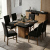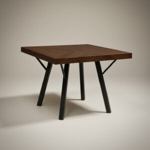 La mesa de melamina castaño, acompañada por una base metálica negra de líneas limpias, dialoga con sillas tapizadas que suavizan el conjunto.