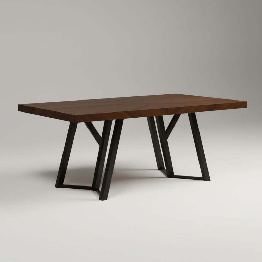 La mesa, para cuatro o seis lugares, se sostiene sobre una base de metal negro de líneas simples que se afinan hacia el suelo, acompañada por sillas modernas en textiles gris o blanco algodón.