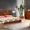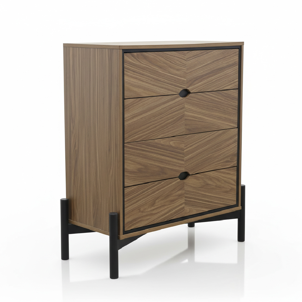 La cabecera y los burós revelan la melamina Toscana en patrones cruzados, acentuados por la presencia gráfica del metal negro.