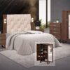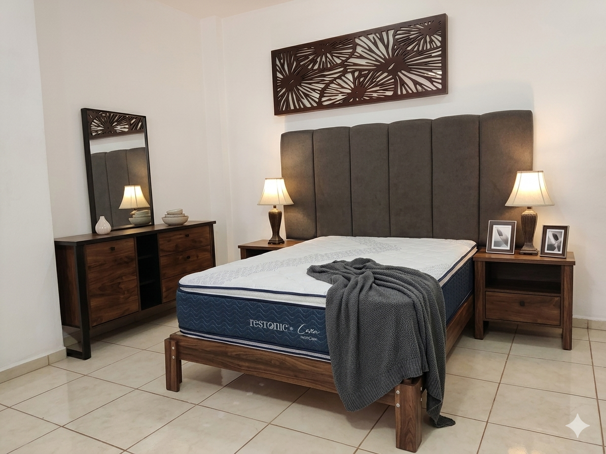 Bonita recamara en color nogal, acabado en laca poliuretano semi mate, estructurada en melamina en 12 mm. Bonita manija metálica . cabecera tapizada en tela color gris; y un moderno diseño en las patas metálicas color chocolate.